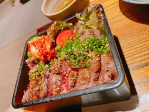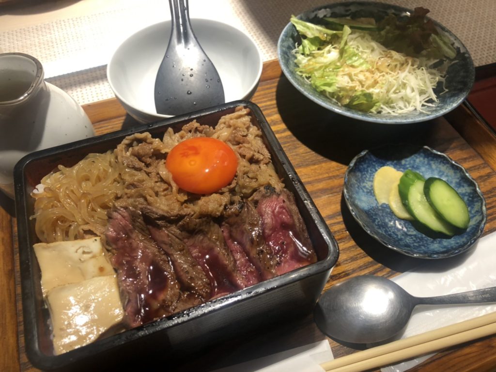 イチボ肉タタキとすき焼煮の合い盛り重を頼んでたぜ