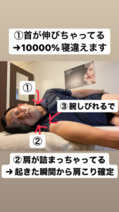 仰向けの時は枕は低めなんだけど、横向きで寝る時は低い枕はNGになるんだ。
